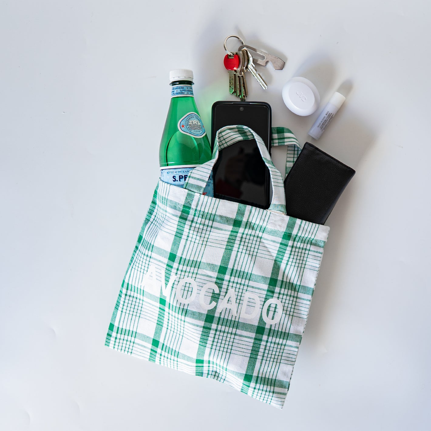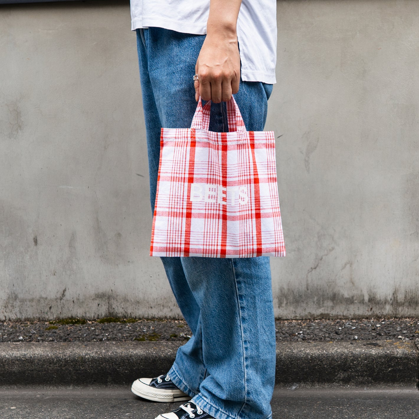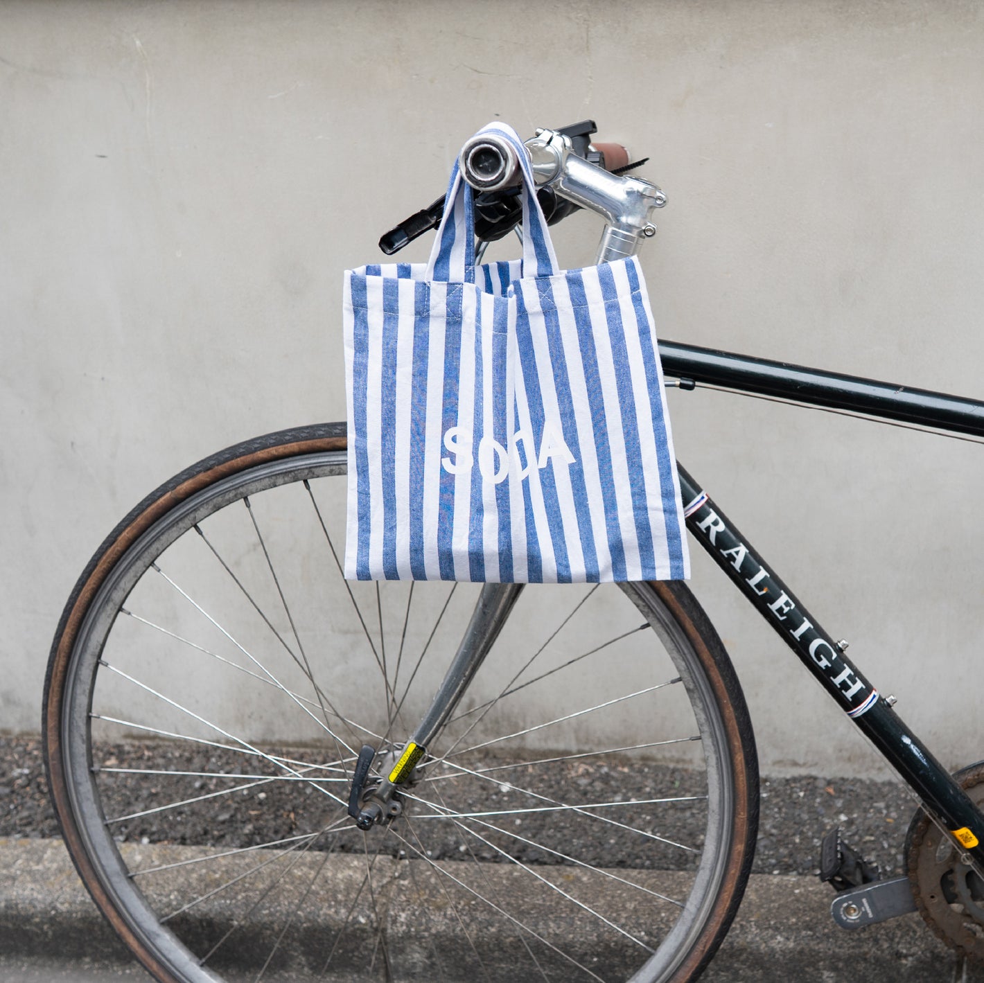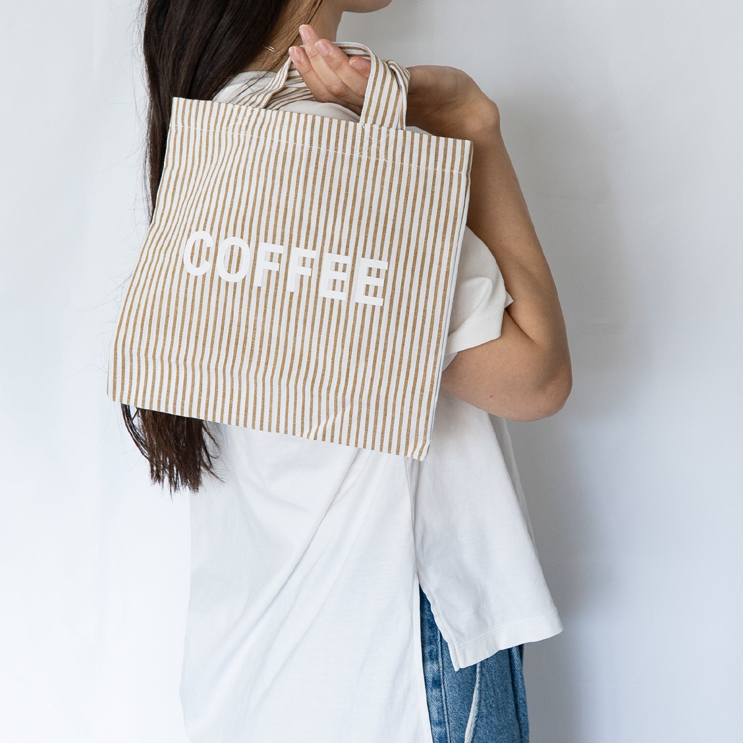 500mlのボトルが縦に収まり、日常にちょうどいいサイズ感のミニバッグです。約25cmのハンドルは、手持ちはもちろん、腕にも余裕をもって掛けられる絶妙な長さ。洗いざらしのインド綿100%に配したポップな単語プリントが、毎日のコーディネートにさりげないアクセントを添えてくれます。