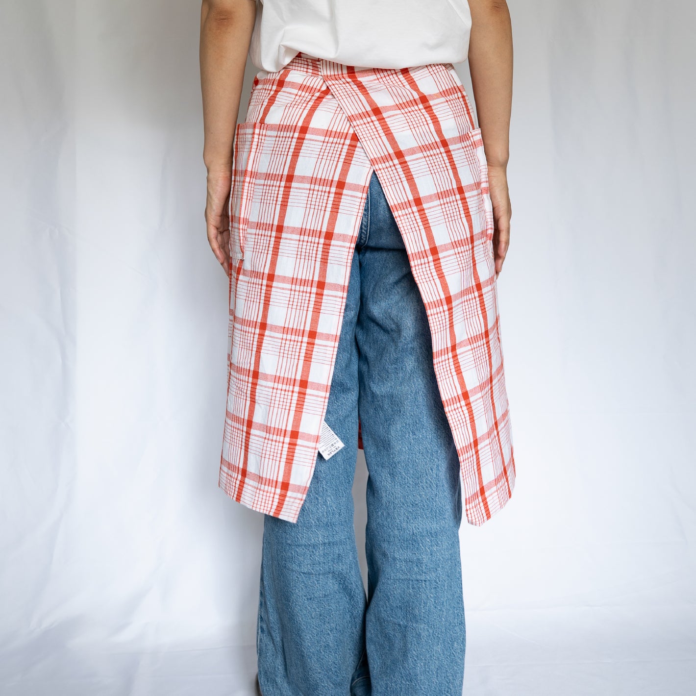 足さばきの良いミドル丈に、背面までしっかり回り込む広めの布幅を合わせました。後ろで生地が重なり合うラップ仕様なので、バックスタイルを気にすることなく、自分らしく動けます。腰紐をキュッと締めるだけで、どんな服装の上からでも形が整う、自由度の高いサイズ感。インド綿のナチュラルな質感と英字ロゴが、何気ない立ち姿をスマートに見せてくれる一着です。