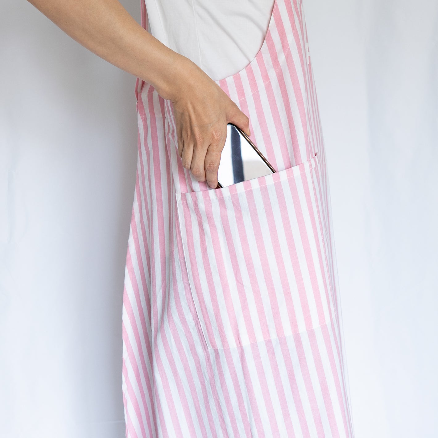 紐やボタンを一切使わず、頭からかぶるだけで着られる潔い設計です。肩への負担を分散する4cm幅のストラップを採用し、長時間着ていても疲れにくい仕様にこだわりました。裾に向けて広がるシルエットは、足さばきの良さはもちろん、立ち姿をスマートに見せてくれます。インド綿の風合いに映えるポップなカラーと英字ロゴがアクセント。中に着る服を選ばず、誰が着てもこなれた印象に仕上がる一着です。