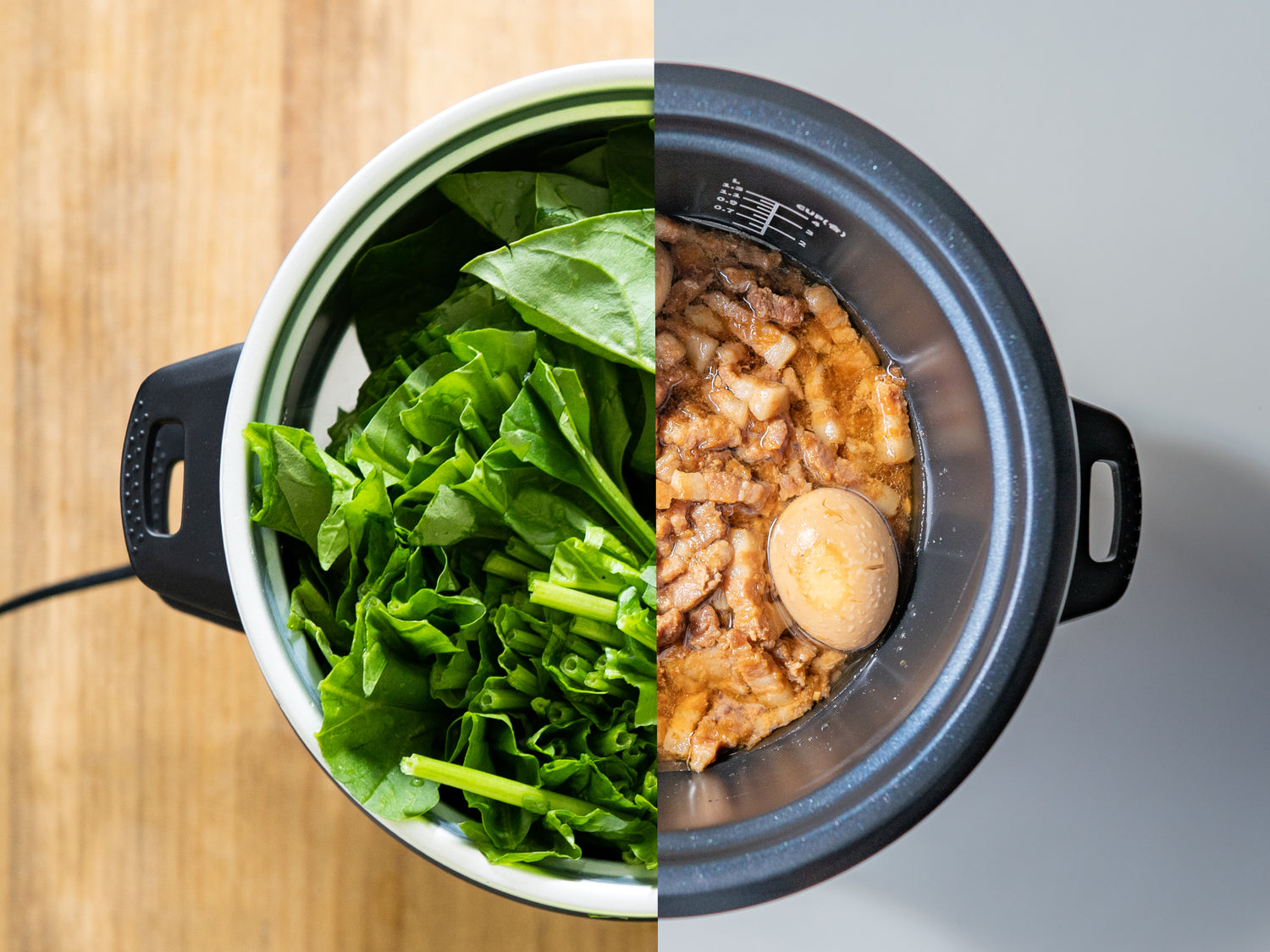 角煮を煮込みながら野菜とゆで卵を調理するなど
