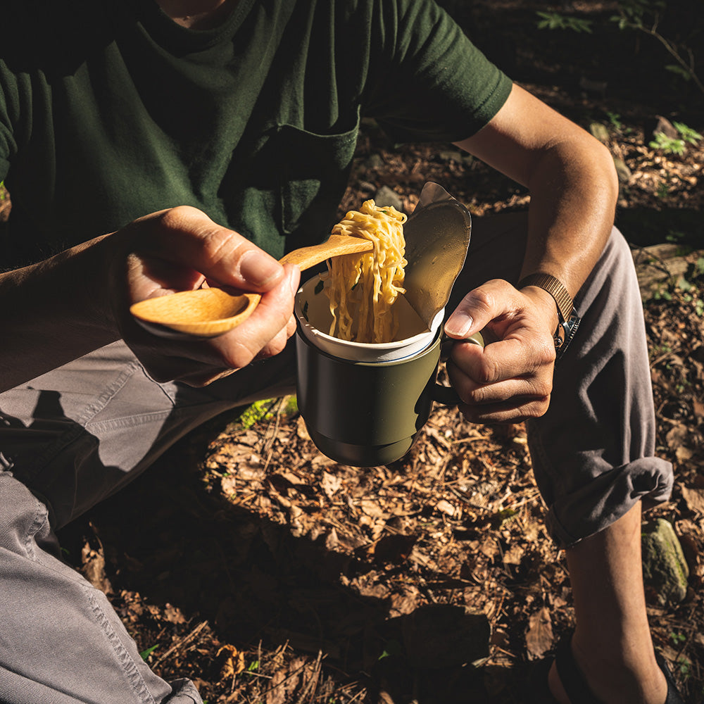 具だくさんなスープにも使えるほどのビックサイズマグカップはカップメンをぴったり収納する事ができ、ハンドル付きカップメンホルダーとしても使える優れもの。スタッキングができるので、家族分のマグを持ってキャンプに行くときもかさばりません。